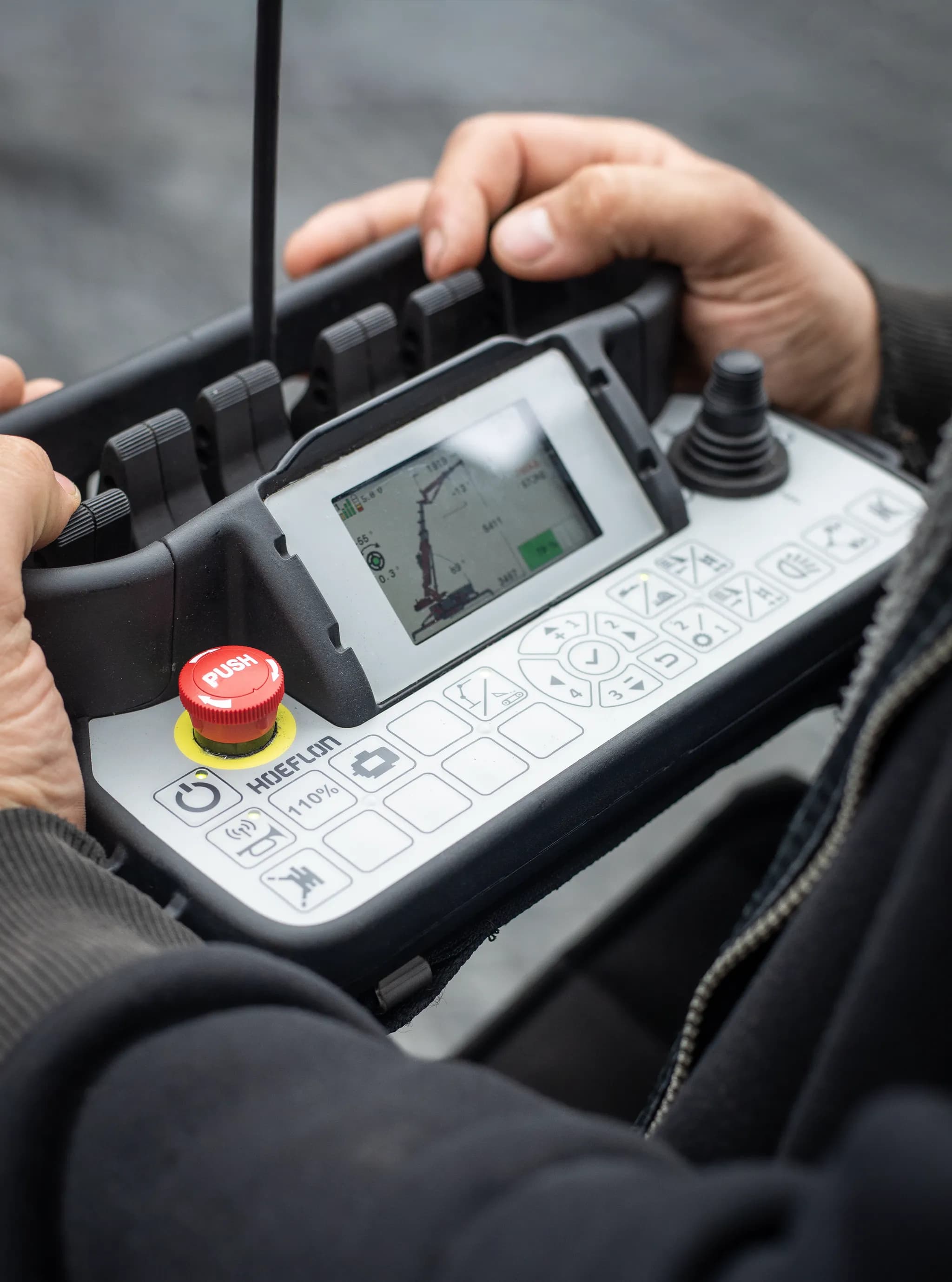 Furthermore, all mini crawler cranes are equipped with a radio remote control. The display immediately shows the lifting capacity being used and the weight on the hook, so you always have complete control.