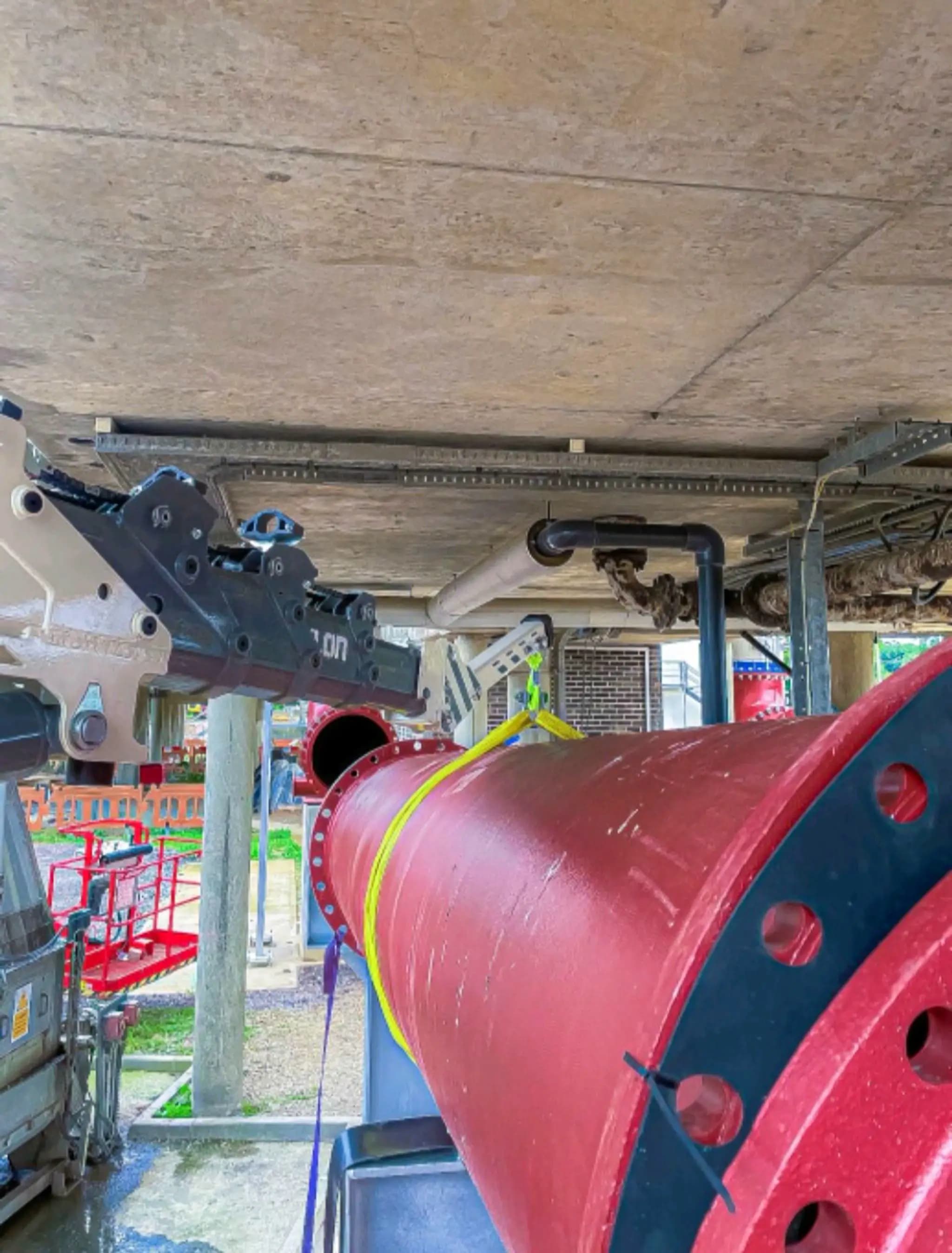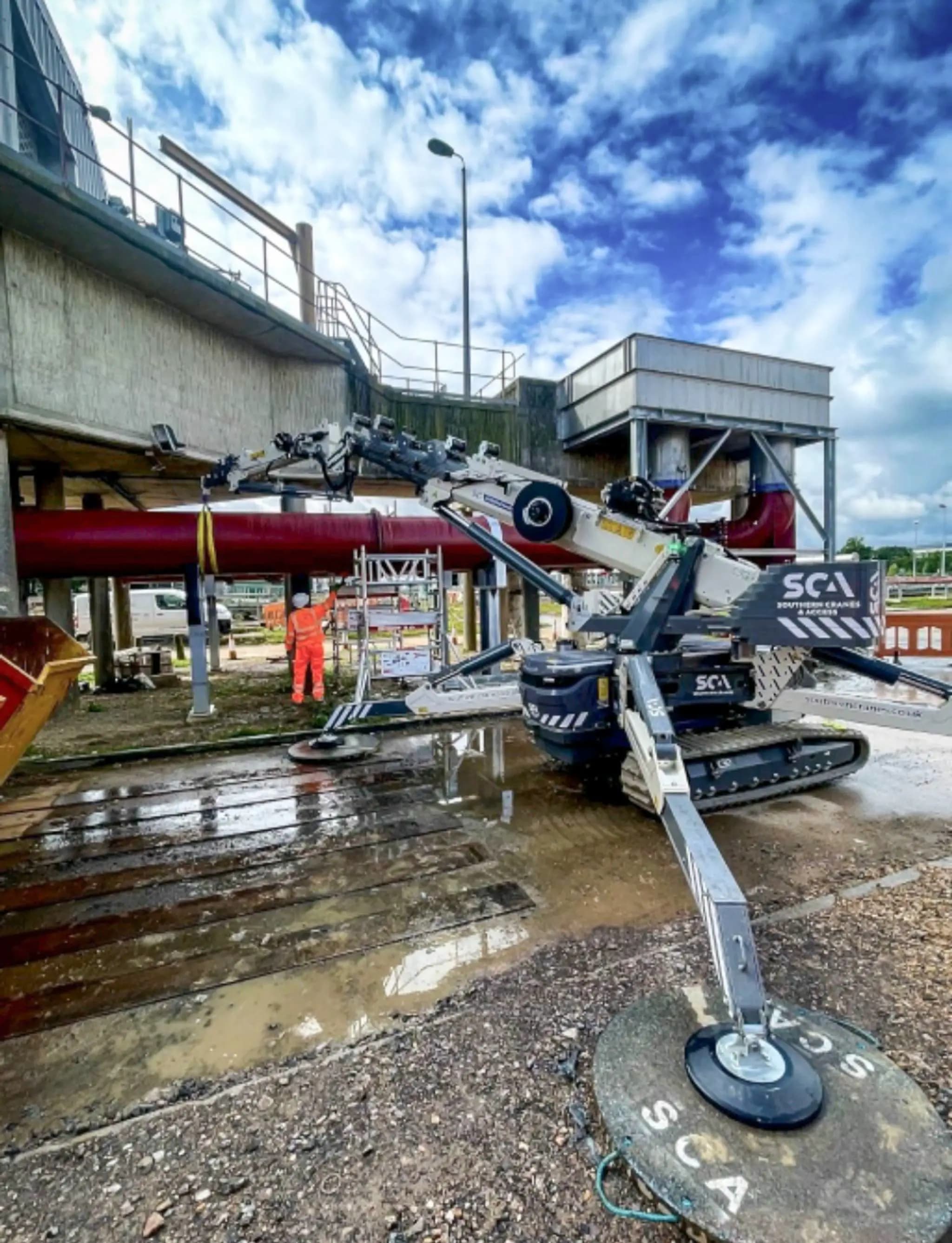 A Hoeflon C30e from Southern Cranes and Access lifted 2 ton pipes into position on this job. This crane was perfectly suited to maneuver in this tight space.
