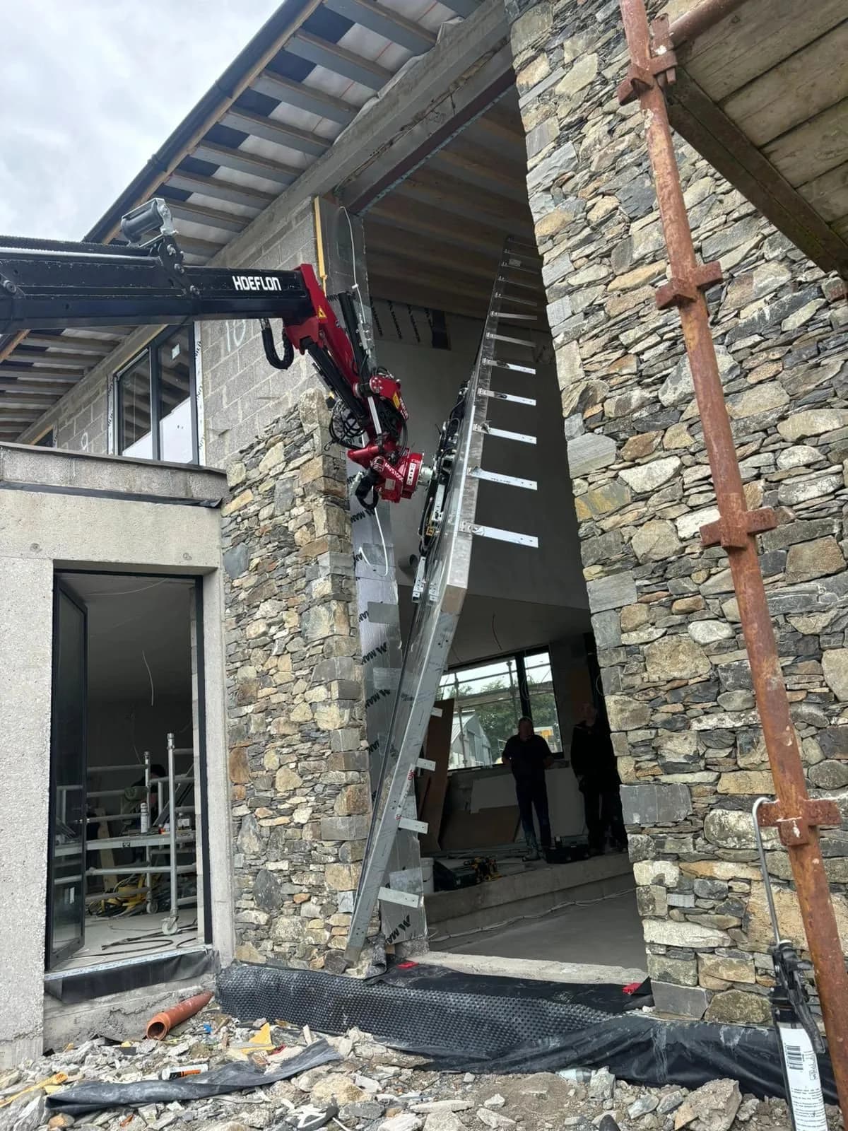 The Hoeflon C30e was chosen for this project, combined with the Multitool, Multivac, and S1000. This configuration proved to be the perfect solution for carefully and safely moving the heavy glass panels. Thanks to the versatility of the Multitool, the smooth movements of the crane, and the highly precise radio control, the glass panels could be positioned precisely.