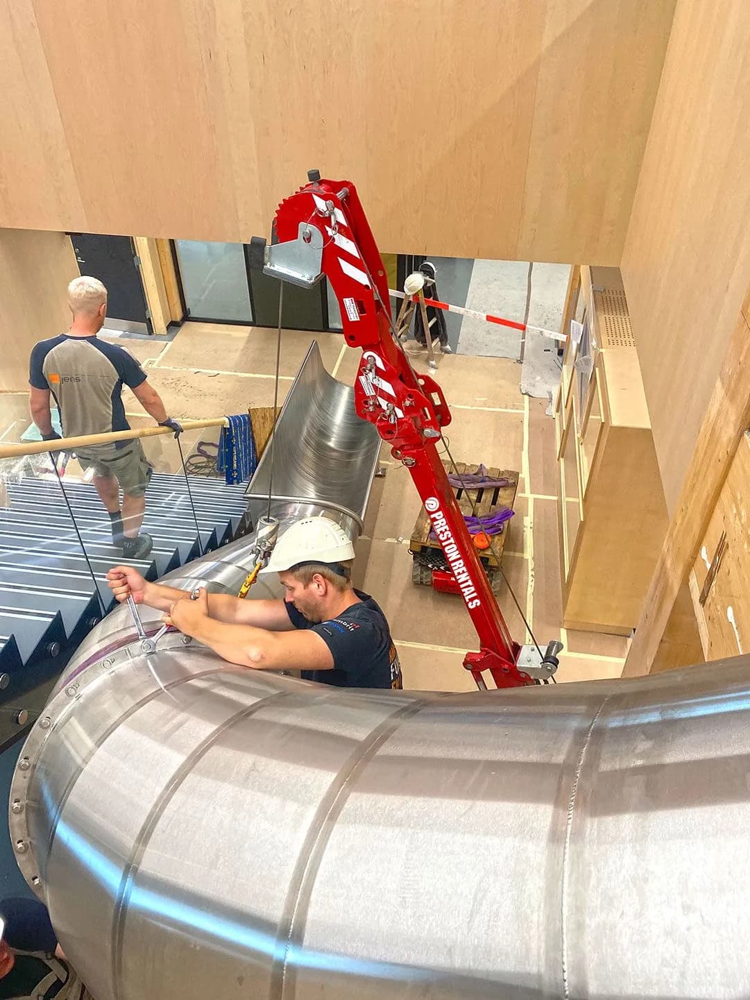 Preston Rentals recently deployed a clever combination of compact lifting and transport for a unique indoor project. A Hoeflon C1e mini crane and a TC1 transport carrier were used to precisely position and install a custom-made slide.