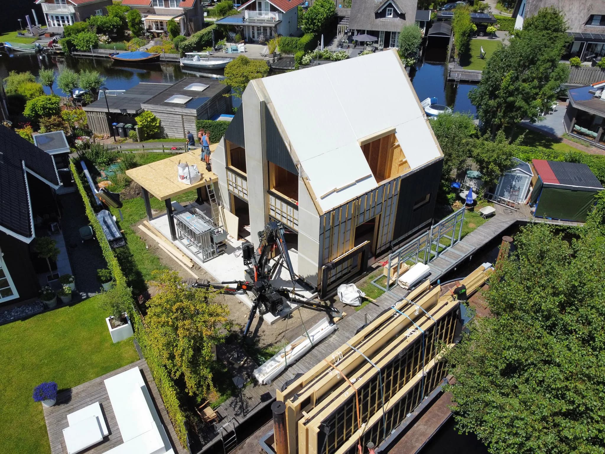 We always have a team of two people. One person carries the cart with the walls, and the other drives the van with the Hoeflon crane. Our construction projects often take longer, so the crane is usually at the same location for a week. We use the crane to install elements like bulkheads, roofs, and upper floors.
